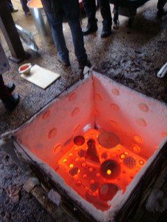Today we did a Raku firing out in the yard of the university. Not sure whether everybody in the building enjoyed the smoked-kipper smell but we had great fun and some stunning results. It's such a quick and immediate technique during which one can see the firing and melting of the glazes. Very satisfying! Here is one of my pieces using two glazes (white crackle and turquoise lustre glazes). The black is the soot from the firing.